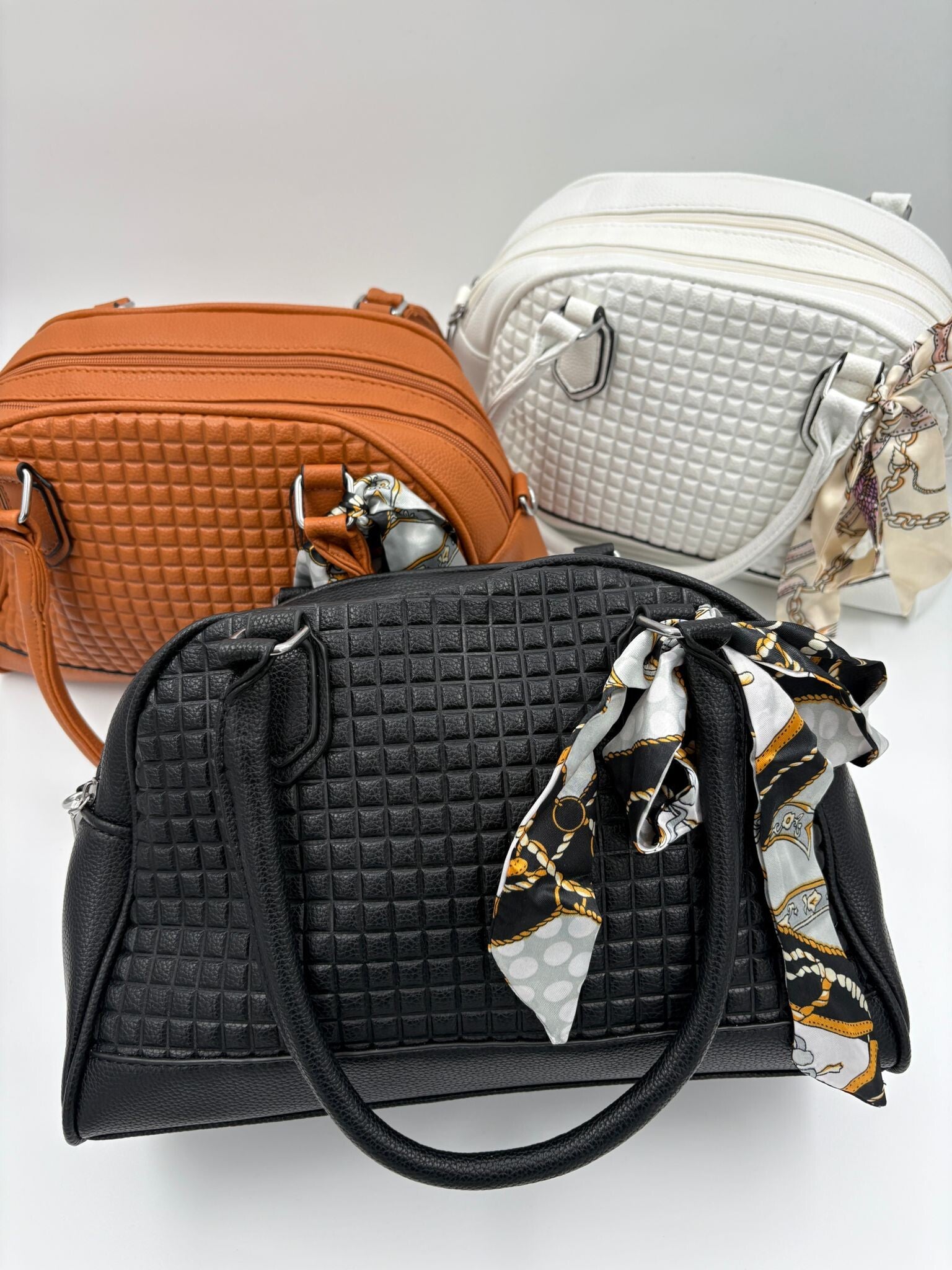 Deze handtassen zijn trendy en veelzijdig, ontworpen met een opvallend geruit reliëfpatroon en verkrijgbaar in verschillende kleurvariaties zoals donkerblauw, rood, cognac, wit en zwart. Elke tas heeft een elegante afwerking met zilverkleurige metalen details en een decoratieve zijden sjaal aan het handvat, wat zorgt voor een speelse en luxe uitstraling.