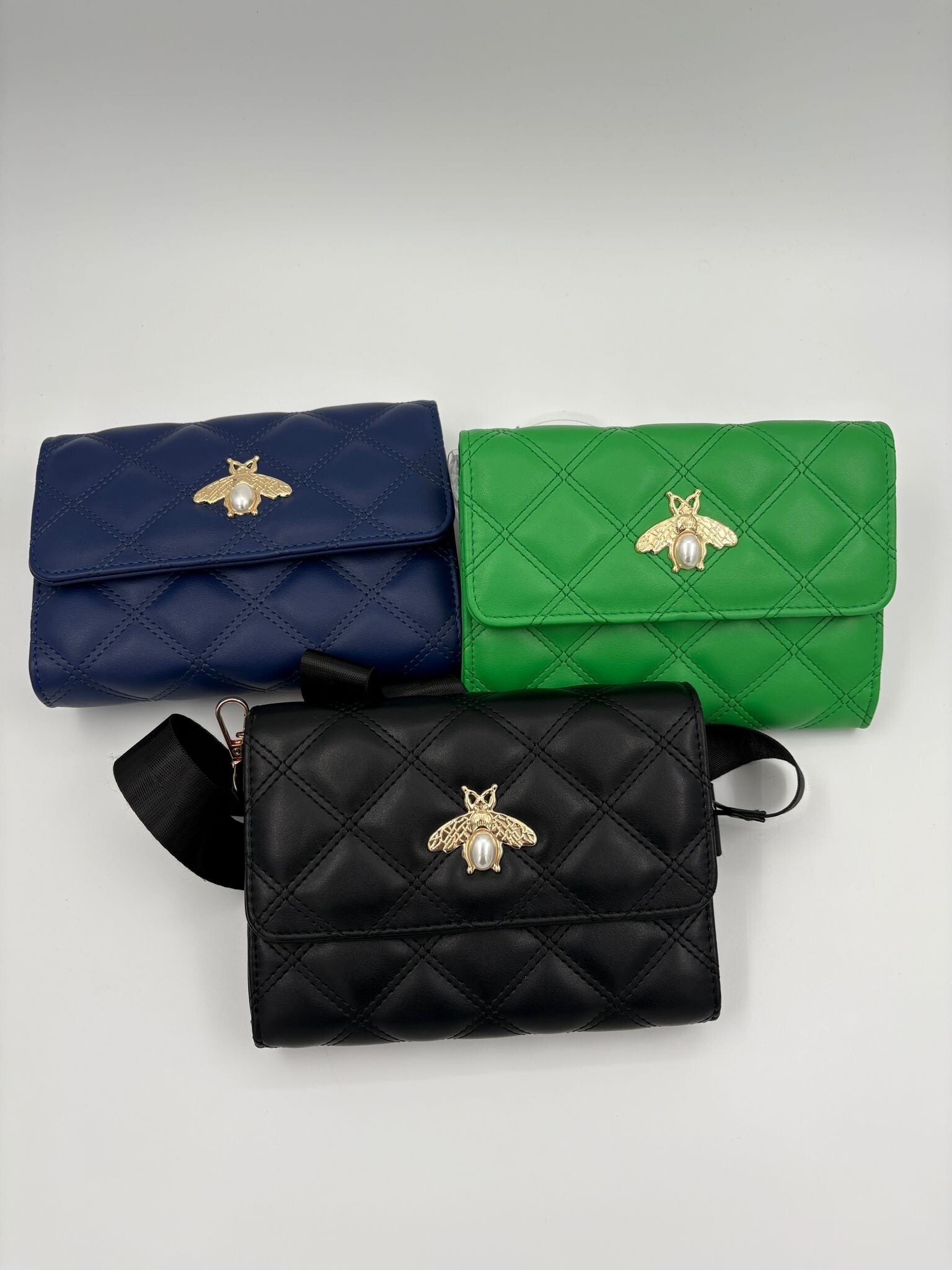 Deze stijlvolle crossbody tas valt direct op door het quilted patroon en het goudkleurige bij-embleem met pareldetail. Verkrijgbaar in zwart, donkergroen en donkerblauw, perfect voor wie een uniek en modern accent wil toevoegen aan de outfit.